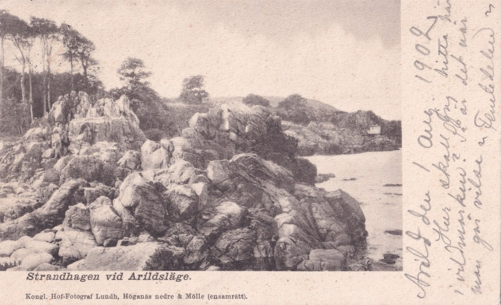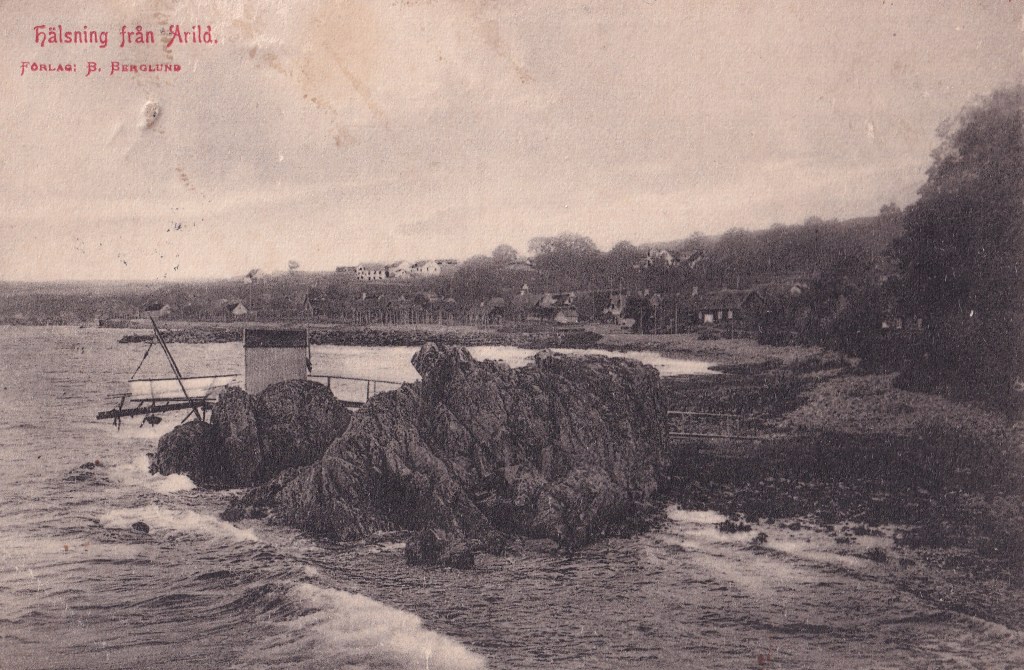 Fotografiet ovan har även getts ut som vykort av Carl Nilssons Ljustrycksanstalt, som endast gett ut ett fåtal vykort från Arild. Carl Nilsson passade på att kolorera motivet för att göra vykortet än mer åtråvärt.