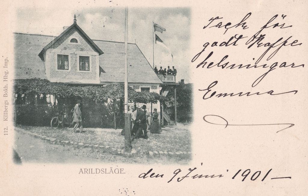 Detta fina vykort på Hotell Mor Cilla är också ett av de tidigaste vykorten från Arild. Detta exemplar skickat 1901 men vykortet är något eller några år äldre. Hotellet var vid denna tid mycket känt och hade varit en viktig plats i Arild i decennier.
