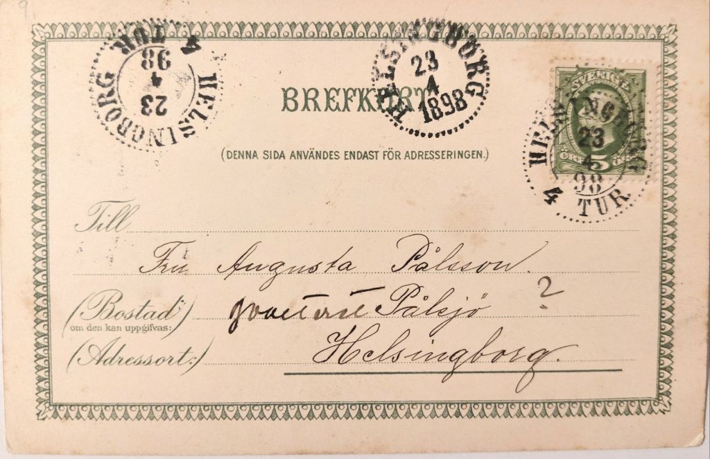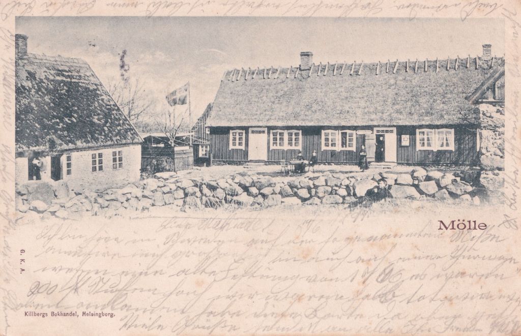 Ett annat motiv som förekommer på vykort skickade före 1900 är denna vy över Hotell Kullaberg och hamnen i Mölle. Fotografiet är taget av Peter P. Lundh men vykortet gavs först ut av Killbergs förlag i Helsingborg.
