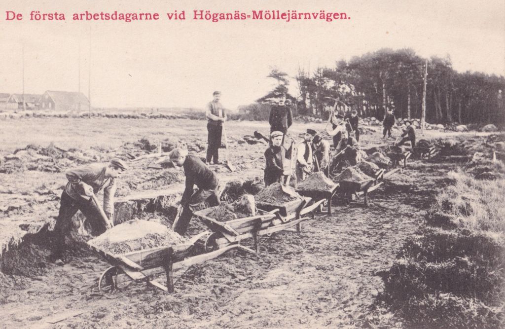 På vykortet nedan ses arbetet med järnvägen som snart nått Strandbadsskogen. Stengärdet hitom skogen markerar gränsen mellan Väsby och Brunnby socknar. I vänster till bild ligger en tidning i gropen och bokstäverna RATEN kan skymtas, vilket visar att rallarna haft med ”Skånska Social-demokraten” till jobbet. Fotografiet är sannolikt från våren 1909, då det var stora strejker. Ingenjören till höger i bild med det vitmålade riktmärket kan vara Einar Sahlén. I bakgrunden ses tre kostymklädda herrar, möjligen beställare och entreprenör, och övervakar arbetet (se Henrik Ranby, 2020).