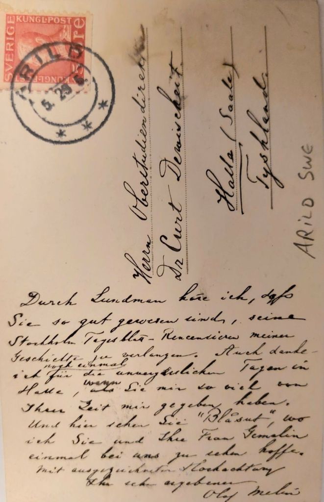 Fotovykortet (dvs. vykort gjort i en mycket liten upplaga och inte för allmän försäljning) nedan visar också Villa Blåsut. Vykortet är skickat till Tyskland 1929 och undertecknat av Olof Melin, som gärna vill träffa mottagaren och dennes fru.