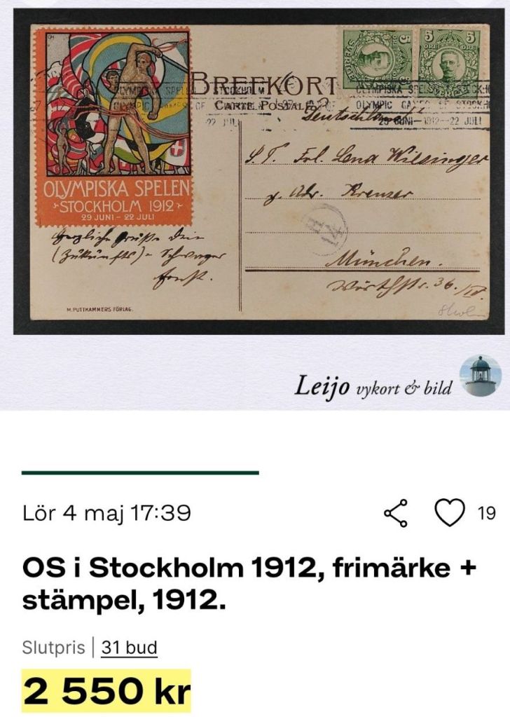 Göran Heijtz har skrivit en fantastisk artikel om post och vykort vid spelen som kan läsas här: https://www.postmuseum.se/bocker/2012/2012-7_73-92_Heijtz.pdf