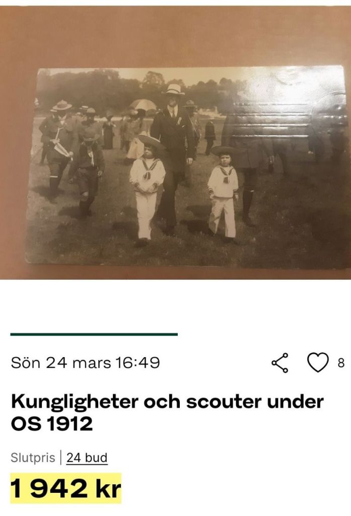 Vykort med sportmotiv och i synnerhet OS är stora samlarområden med köpstarka samlare. Här var det fråga om ett fotovykort på kungligheter och scouter från OS 1912 i Stockholm.