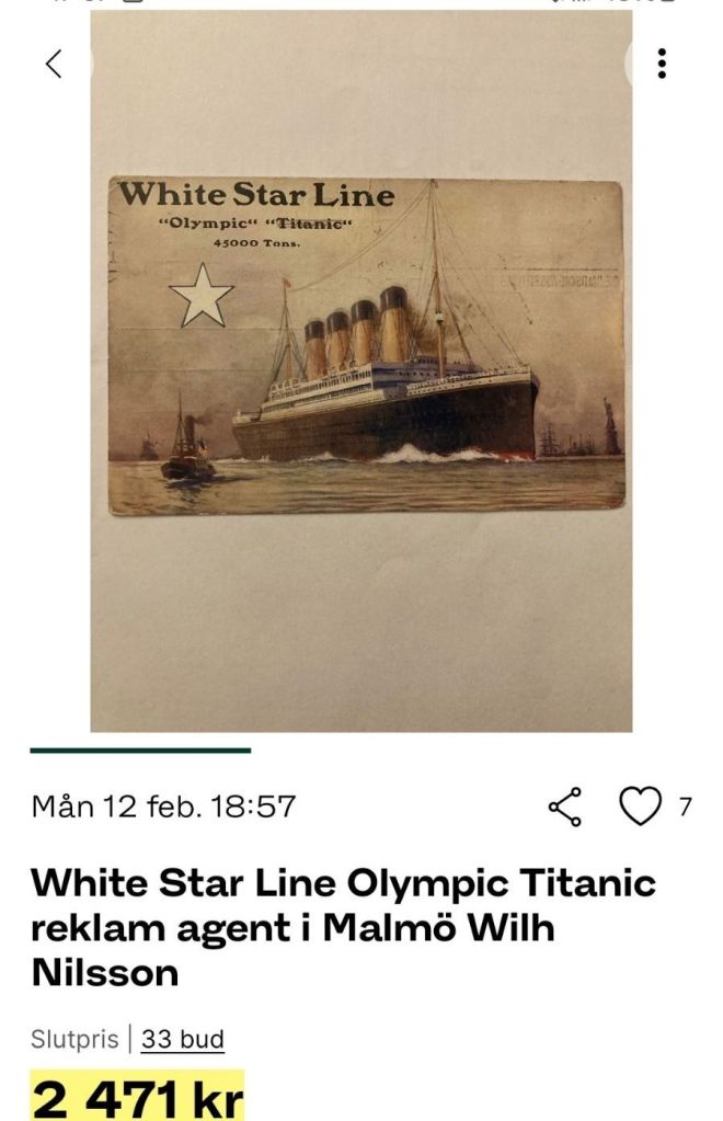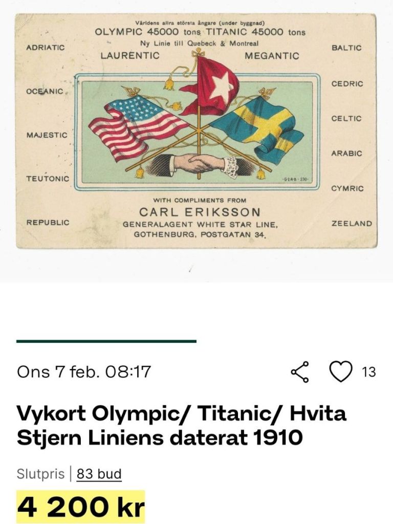 Vykort med koppling till Titanic är bland vykortens heliga graaler. Här ett känt vykort från generalagenten Carl Eriksson. Det var tre budgivare på de högre nivåerna.