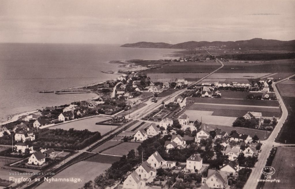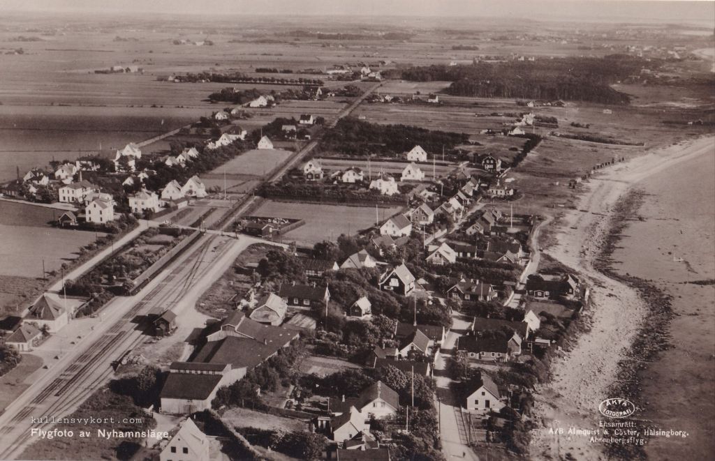På detta välkomponerade flygfoto från slutet av 1930-talet skär järnvägen genom byn, med Kullaberg i bakgrunden. Längst ner till vänster ses återigen Pensionat Strandhem.
