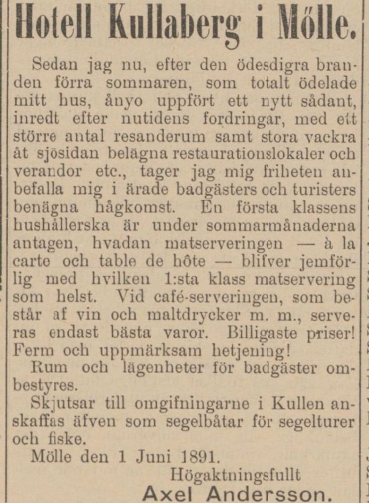 Precis vid hamnen i Mölle ligger Hotell Kullaberg. Historien om hotellet börjar med Axel Andersson, född 1840 i Björkeröd. Axel inledde sitt arbetsliv ombord olika fartyg på de sju haven under 1857–1869. År 1867 gifte han sig med pigan Gustafva Andersdotter och livnärde sig därefter på sillfiske och som skeppare med frakt av olika varor. Han importerade också danskt mjöl vilket var en lukrativ verksamhet.
