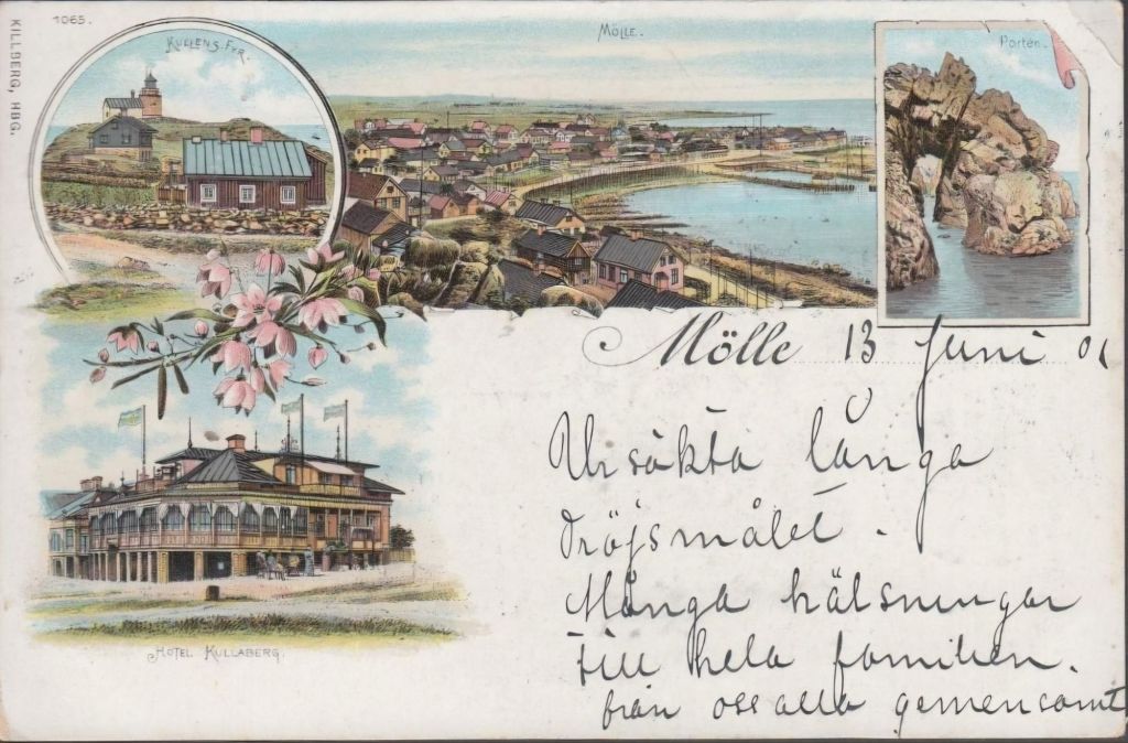 På detta litografiska fyrbildskort finns nederst till vänster en bild på Hotell Kullaberg sett från hamnen. Kortet är sannolikt tryckt omkring 1898–1899.