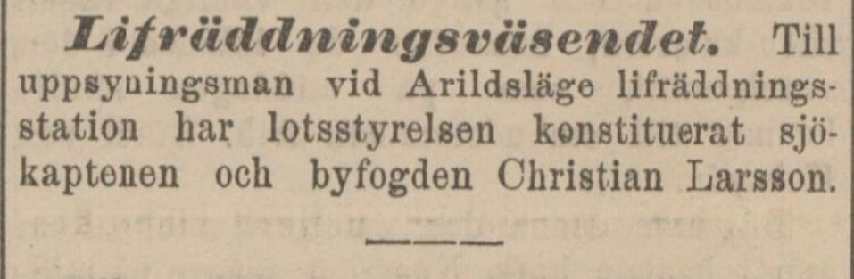 Jan E. Eriksson har skrivit en artikel om räddningsstationen (se Litteratur). Enligt Eriksson är den förste kände arildsbon som blev uppsyningsman med ansvar för räddningsstationen kaptenen och byfogden Christian Larsson, som hade gått i land 1894. Enligt notisen nedan blev han uppsyningsman november 1887. Därefter blev kaptenen Janne Swensson uppsyningsman 1918.