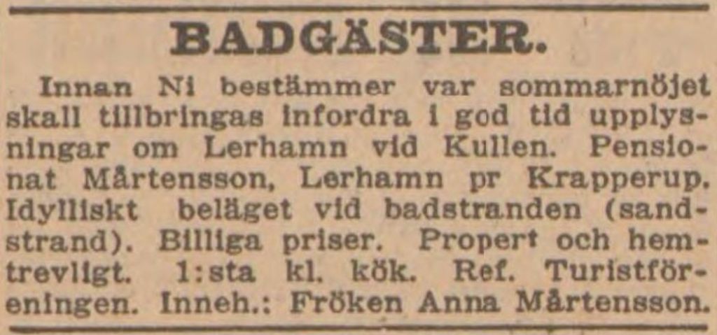 Fröken Anna Mårtensson hade under första världskriget och därefter varit uppskattad mamsell på Krapperup, men ville ta steget och starta något eget. I början av 1920-talet var turistlivet i Lerhamn på uppgång efter de svåra krigsåren.