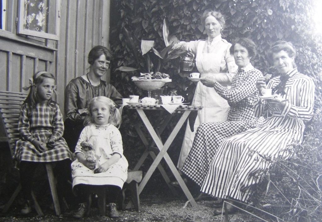 Ett exempel är detta vykort med en familj som dricker kaffe som såldes för 1 144 kr. Samma budgivare återkommer på flera kort av den här typen och de höga priserna verkar därmed inte vara knutna till att budgivarna har anknytning till personerna.