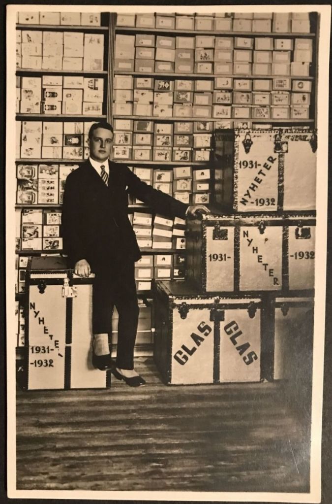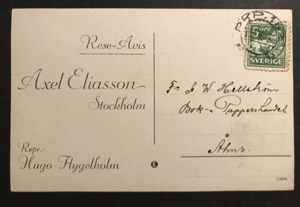 Ett fantastiskt fint och vykortshistoriskt intressant kort på en vykortsförsäljare från förlaget Axel Eliasson såldes för 991 kr.