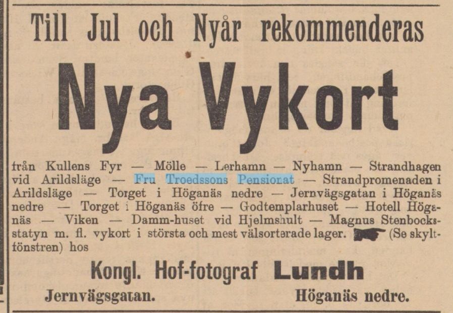 Inför julen 1901 gör bygdens fotograf Peter P. Lundh reklam för nya vykort, bl.a. från Fru Troedssons pensionat!