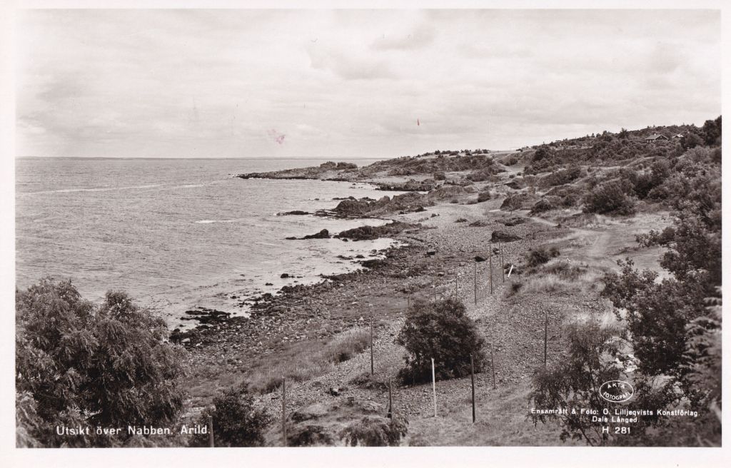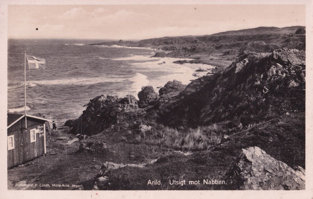 De tre nedanstående vykorten visar vyn mot Nabben från några olika platser längs med stigen från Arild.