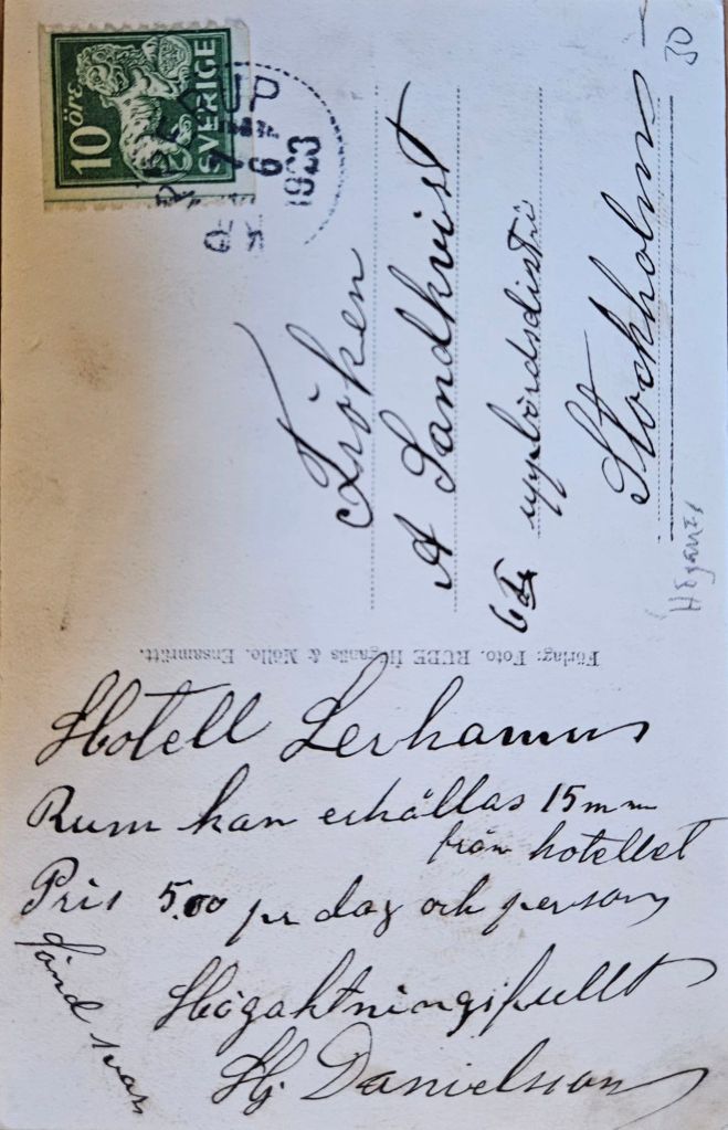 Fotovykortet nedan är från sommaren 1911 och huset är ombyggt. Brevskrivaren har högst upp till vänster skrivit ”Lerhamns pensionat”.