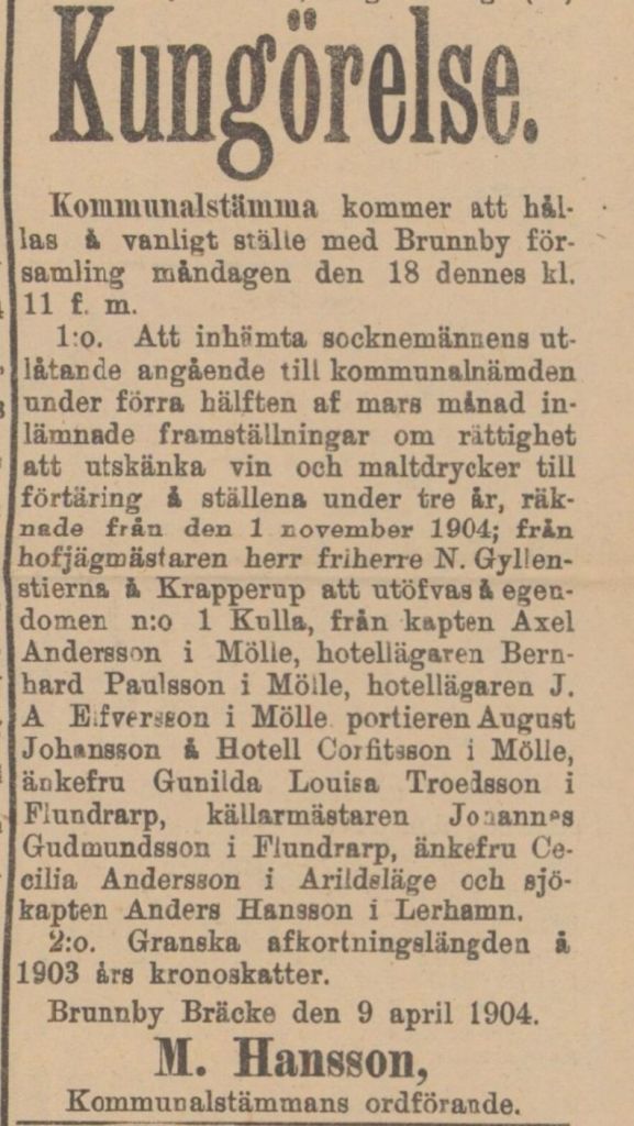 Av kungörelsen nedan framgår att kapten Hansson 1904 sökt tillåtelse att utskänka vin och maltdryck.