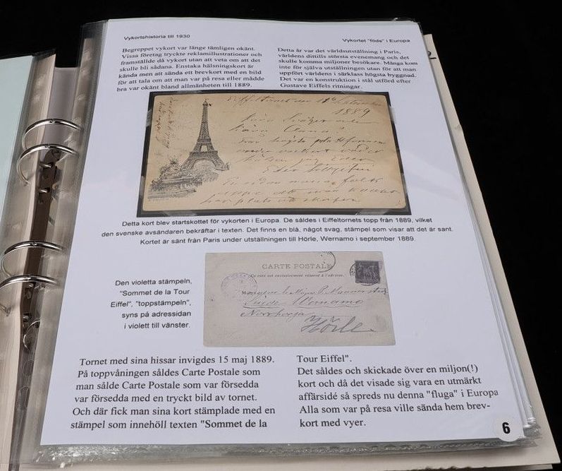En sida ur exponatet med de kända tidiga vykorten på Eiffeltornet från världsutställningen 1889.