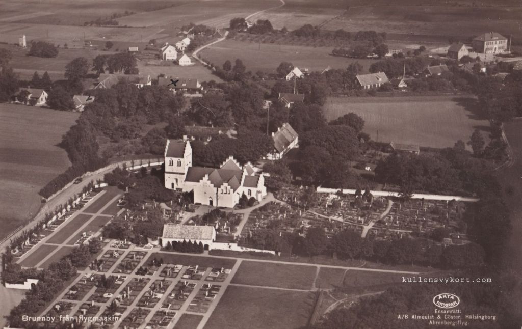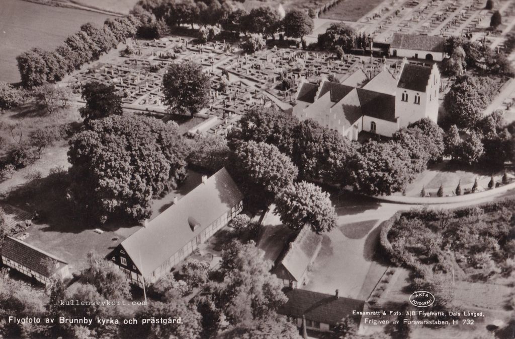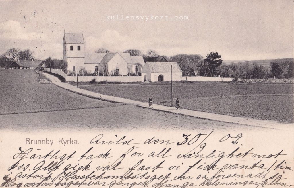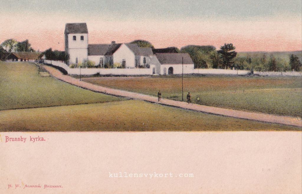 De två vykorten nedan är också bland de tidigaste från Brunnby kyrka, det första utgivet ca 1901–1902. Två cyklister kommer längs med vägen. Vykorten är utgivna av H. W. Agardh som hade affär i Brunnby bara en liten bit bort.