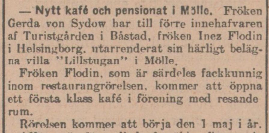 Samma år som Gerda öppnar musikinstitut går det att läsa i dagspressen att Lillstugan arrenderats ut till fröken Inez Flodin som ska ha kafé och resanderum. Hon var innehavare av Turistgården i Båstad och hade erfarenhet av restaurangverksamhet.