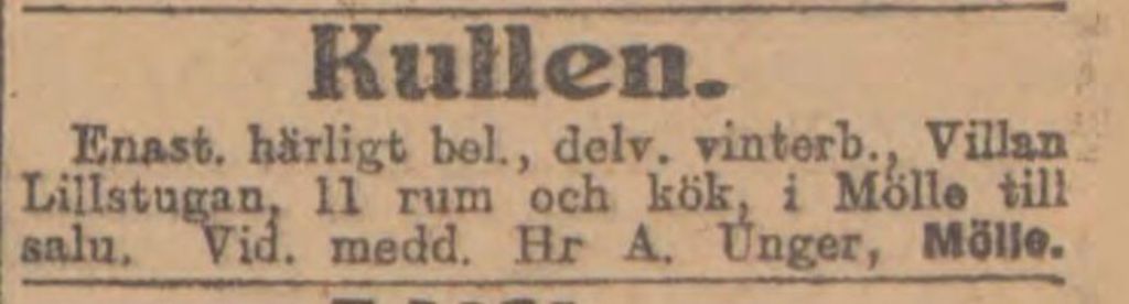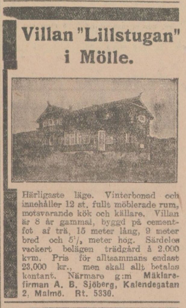 Högt upp i Mölle vid en brant ut mot havet och med en vidunderlig utsikt låg Villa Lillstugan. Huset byggdes 1908 i en klassisk ”schweizisk stil”, lite likt Villa Sophie i Arild.
