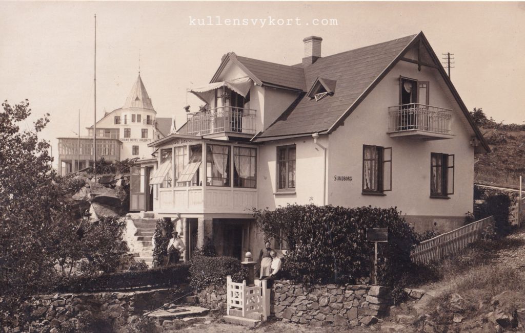På Harastolsvägen 8 i Mölle ligger Villa Sundborg, som ses på fotovykortet nedan. Vilka som står framför huset känner jag inte till. Kanske är det husägarna eller turister på besök. Vid början av muren framför huset finns en skylt. Texten är otydlig men ordet værelser, dvs. rum på danska, syns. Att hyra ut rum till turister var vanligt bland Mölles husägare.