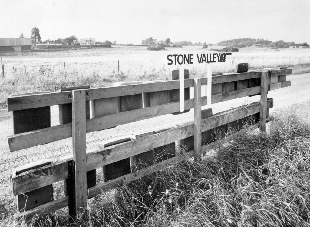 På fotografiet nedan ses Falkamöllan i bakgrunden och i förgrunden ett gäng brevlådor och en skylt med ”Stone Valley”.