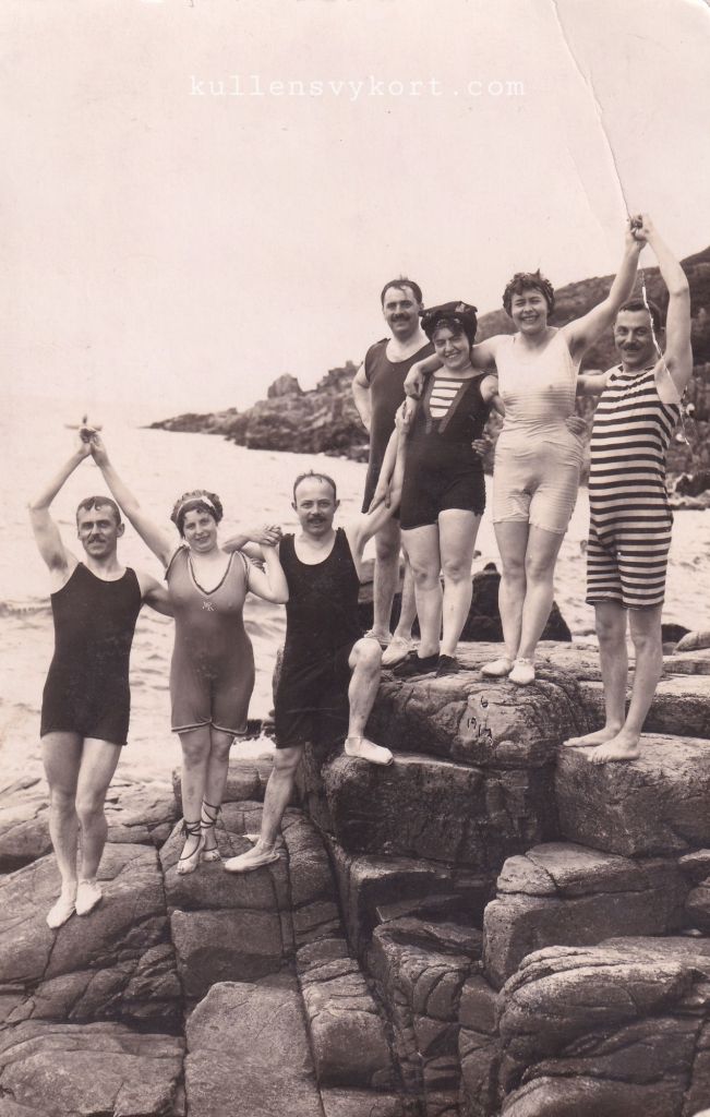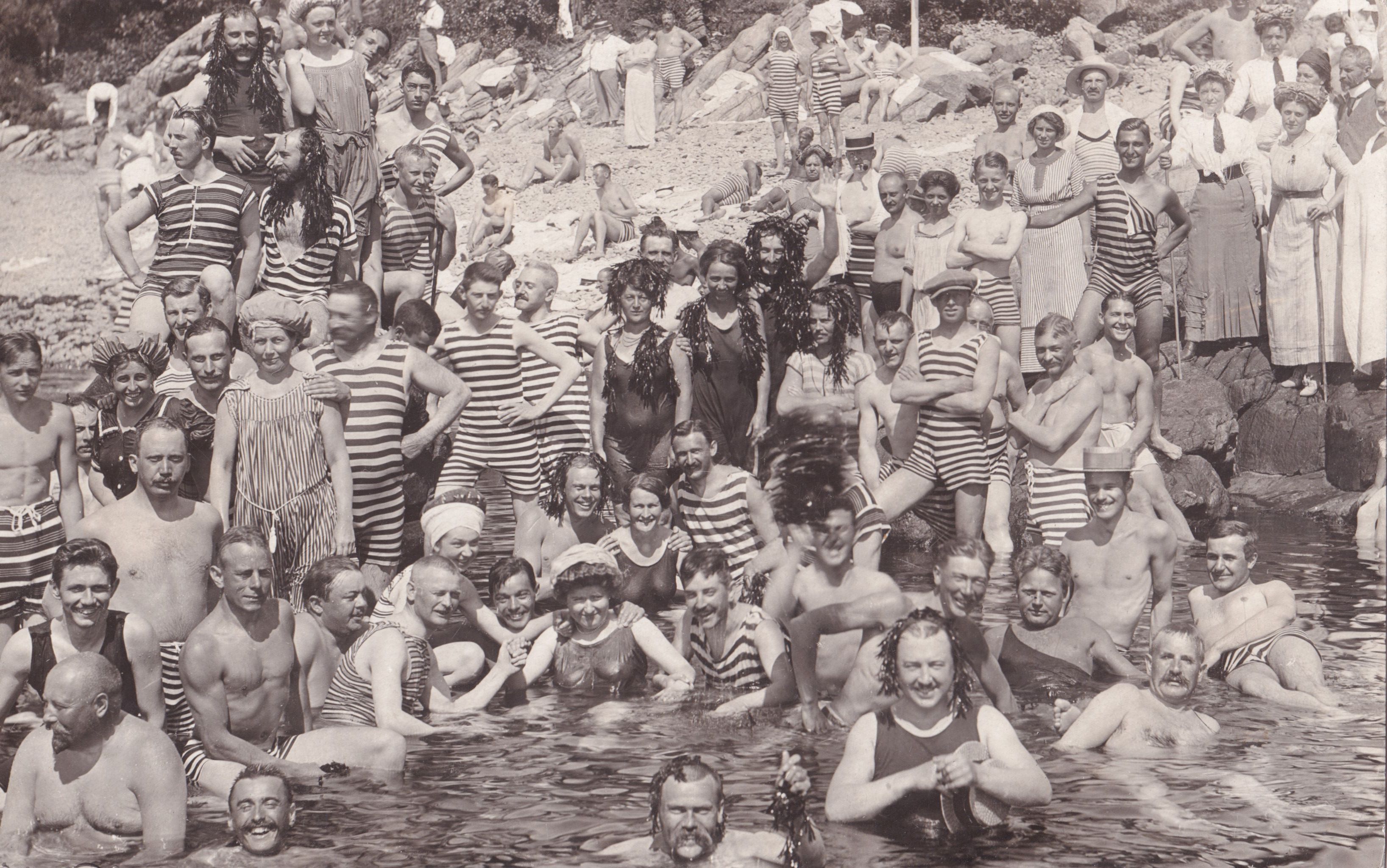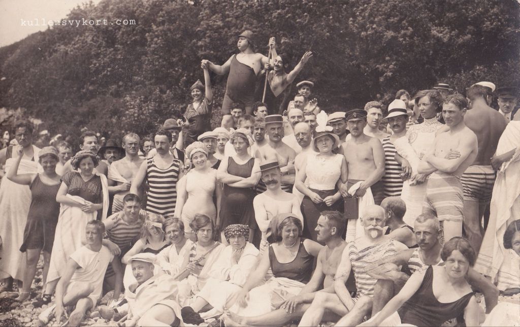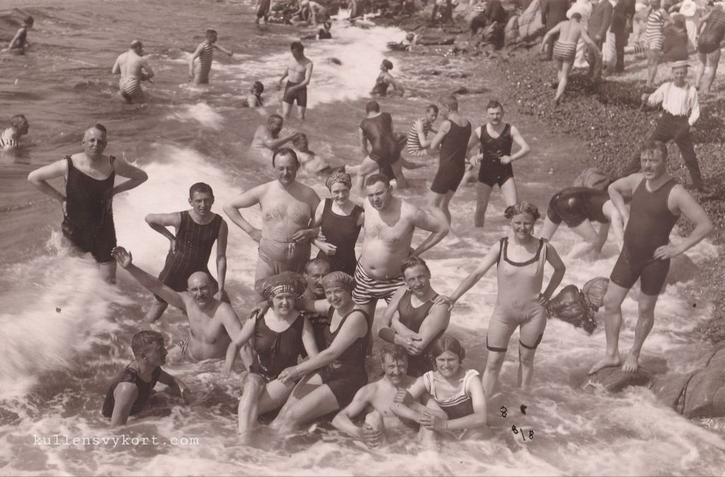 Många av de här fotografierna blev ganska udda när män i hög hatt och kvinnor i långklänning blandades med badare i badkläder. I många fall var det fler som tittade på badarna, än som själva badade.