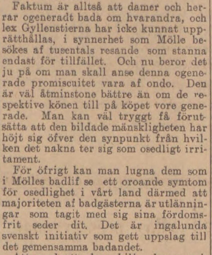 Från 1910 började trots allt en diskussion om att styra upp situationen. Fokus låg till stor del just på själva badmodet. Det var den halvnakna manskroppen som sågs som ett stort problem. Män med endast badbyxor, fast de badade med kvinnor.