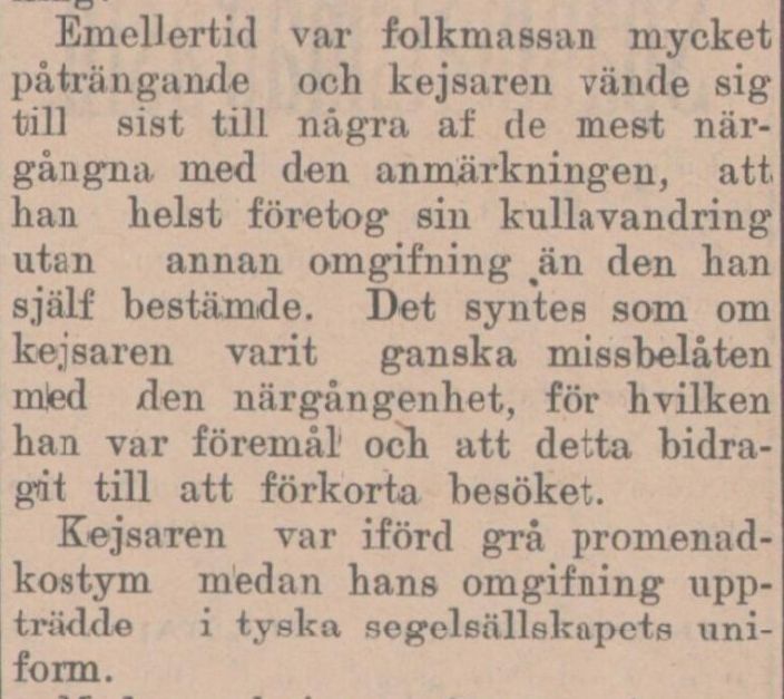 Besöket bevakades noga i flera tidningar. Nedan utdrag ur Sydsvenska Dagbladet som hade en lång artikel om besöket. Som framgår av artikeln var kejsaren besvärad av stora folkmassor som följde efter honom. Detta trots att kejsarens adjutanter sagt åt folket, åtminstone de tyska turisterna, att hålla sig undan.